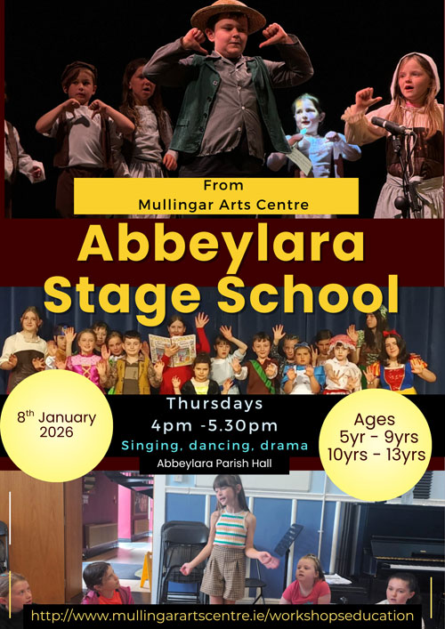 A taster class happens on the 8th January 2026. 4.00pm - 5.30pm €10 for the session. Come act, sing, dance and play. Spread the word. 5yrs - 13yrs. |